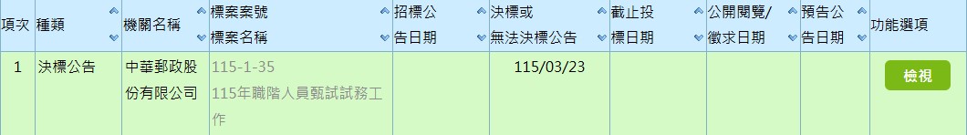 (公職王編輯)中華郵政股份有限公司近日公布最新採購決標資訊,針對「115年職階人員甄試試務工作」相關採購案,已完成決標程序,並於115年3月23日正式公告,後續將依規劃推動甄試相關作業。