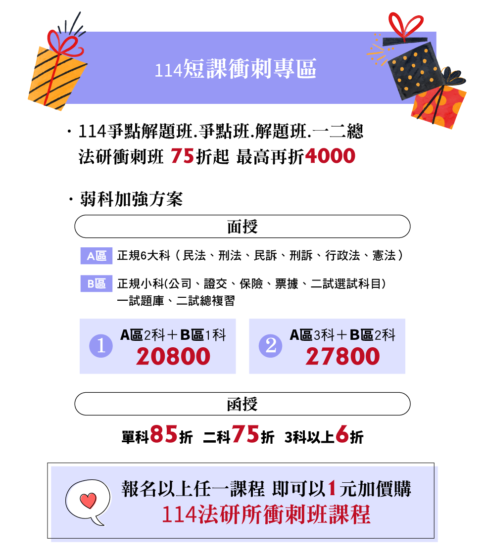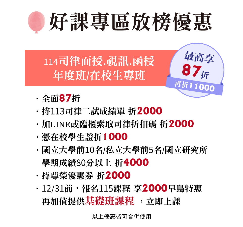 第二、三年司律單科任選3科+爭點、解題、一二總(三擇1)