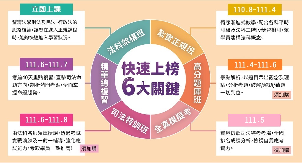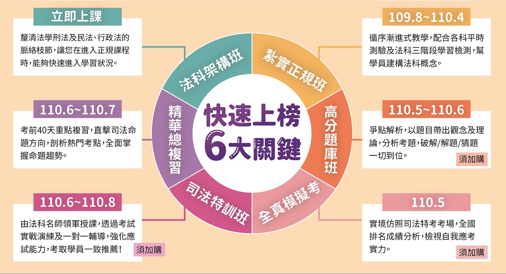 《法學基礎課》→《正規課》→《選擇題庫班/申論考試班》→《全國模擬考》→《修法時事議題講座》→《答題能力檢測》→《衝刺特訓班》→《總複習班》