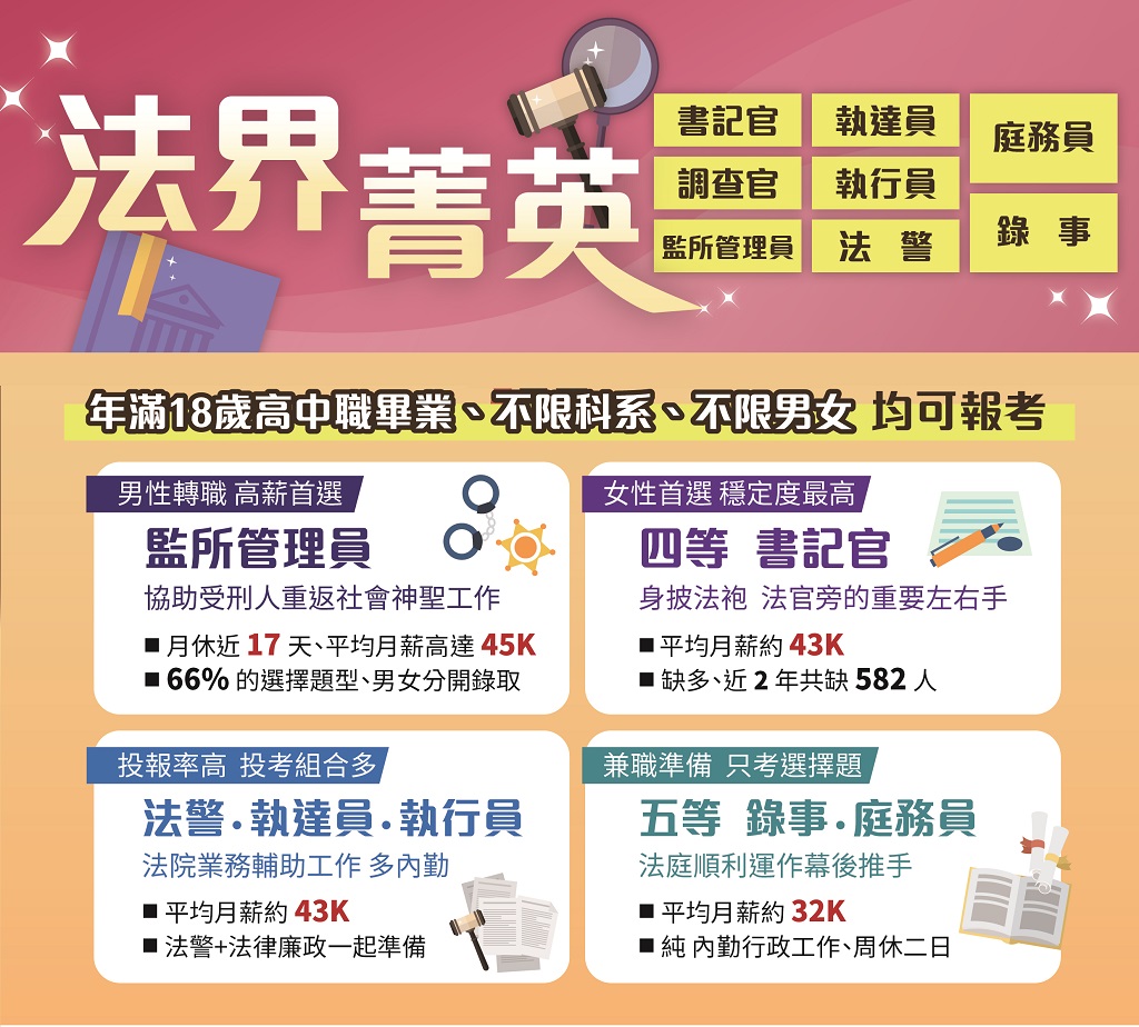 | 未來展望 | 1.書記官轉考司法官/律師是很常見的現象,也是書記官更上層樓的出路之一。 2.書記官調薪幅度也較大,也可以一直晉陞至八職等。 |
