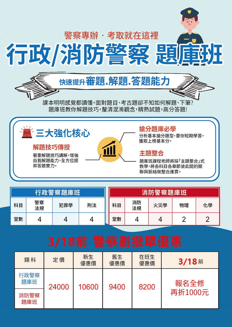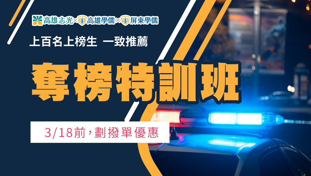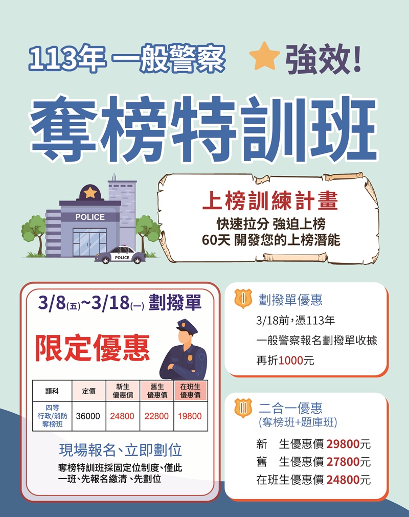 【113行政/消防警察】奪榜特訓班3/18前劃撥單優惠