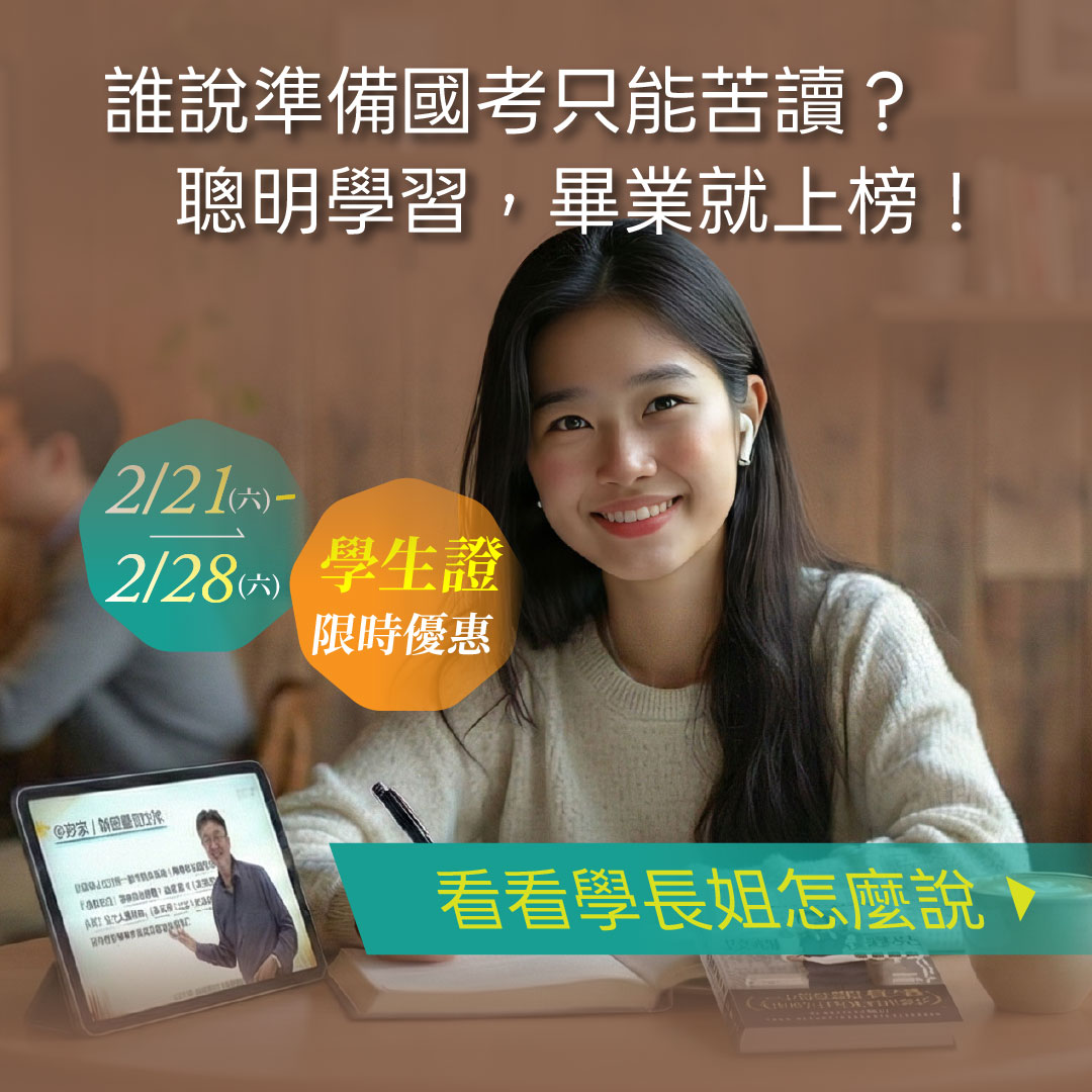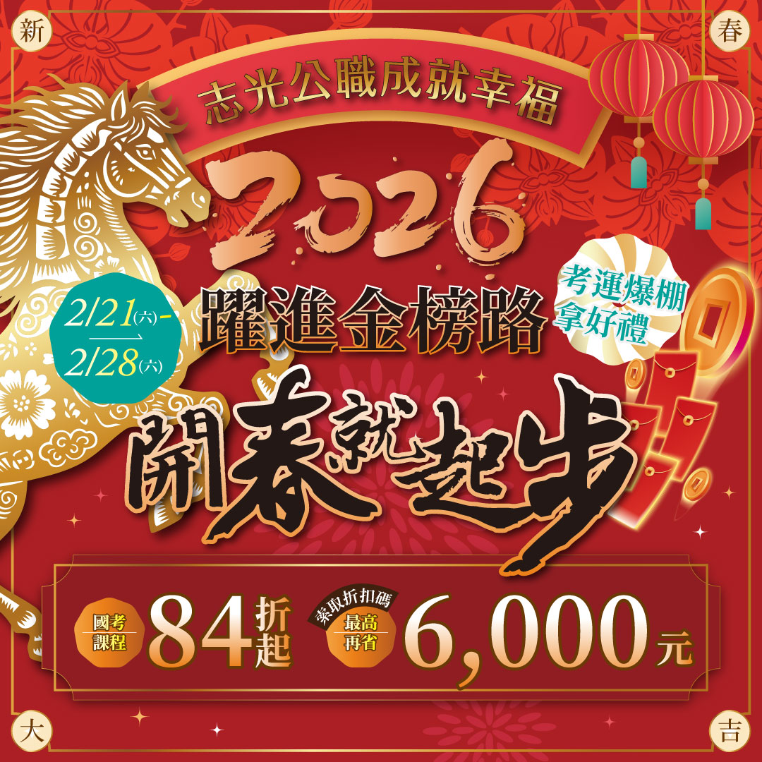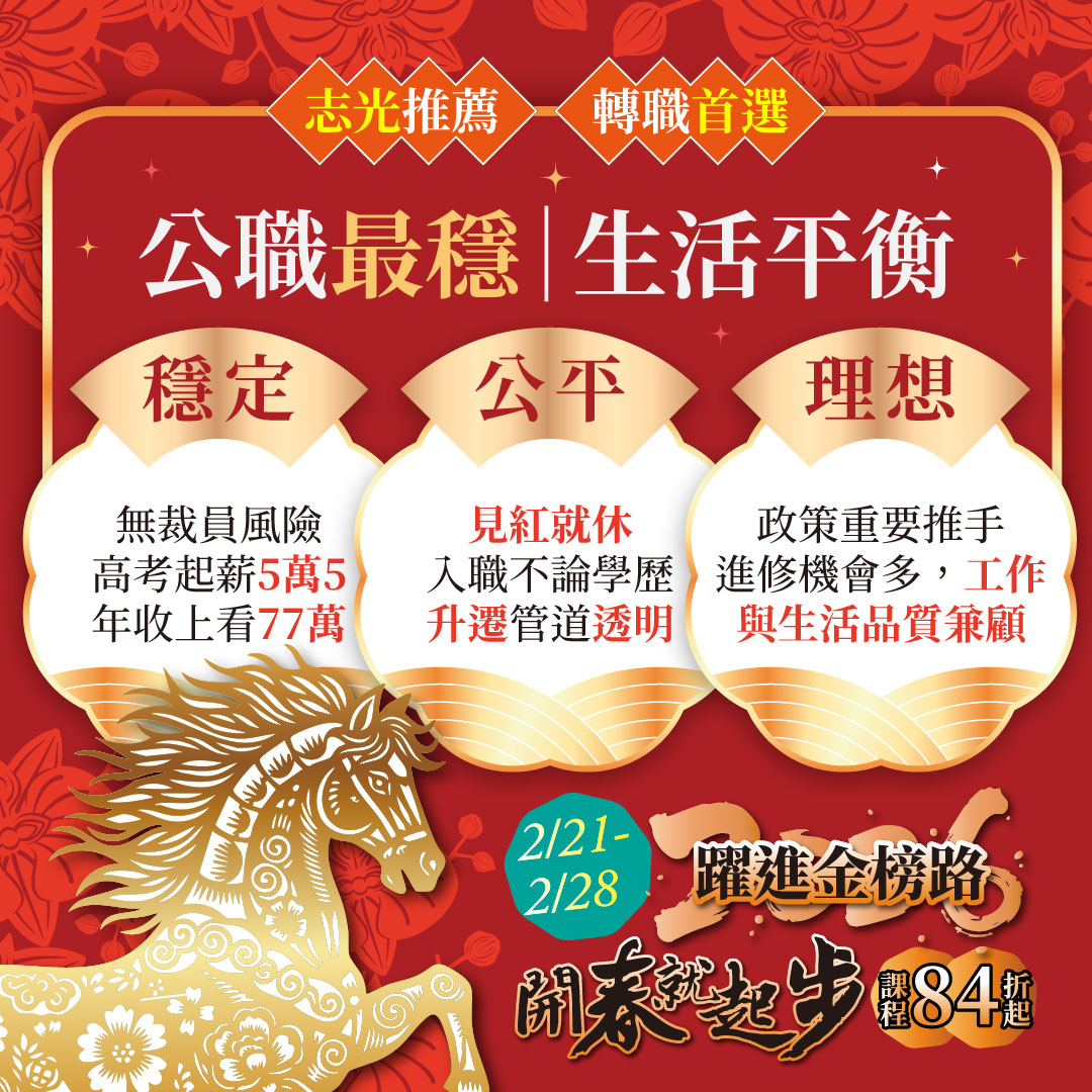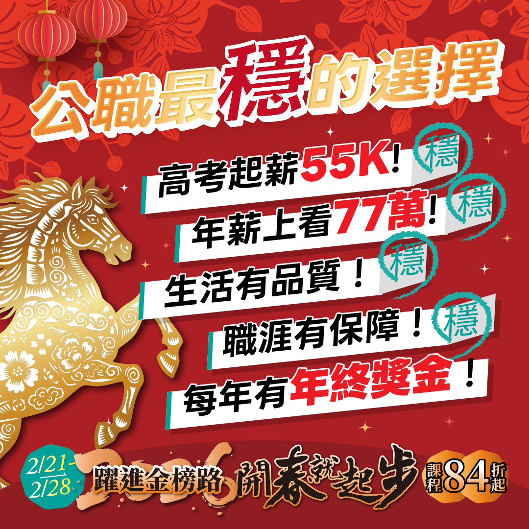活動期間:2026/2/21(六)-2/28(六) 想要一份穩定、制度清楚、兼顧生活品質的工作嗎? 公職一直是許多人轉職、規劃長遠未來的首選。 🎊 限時優惠:課程 84 折起,最高現省 6,000 元
