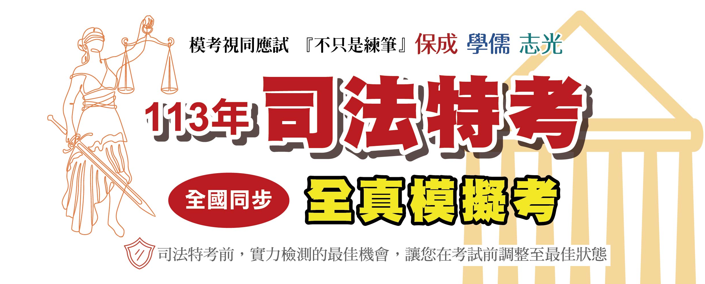 113司法四等特考全國模考,模擬司法正式考試,增加你考試的臨場感及自我學習進度的檢視,讓你在國考路上知彼知己‧百戰不殆