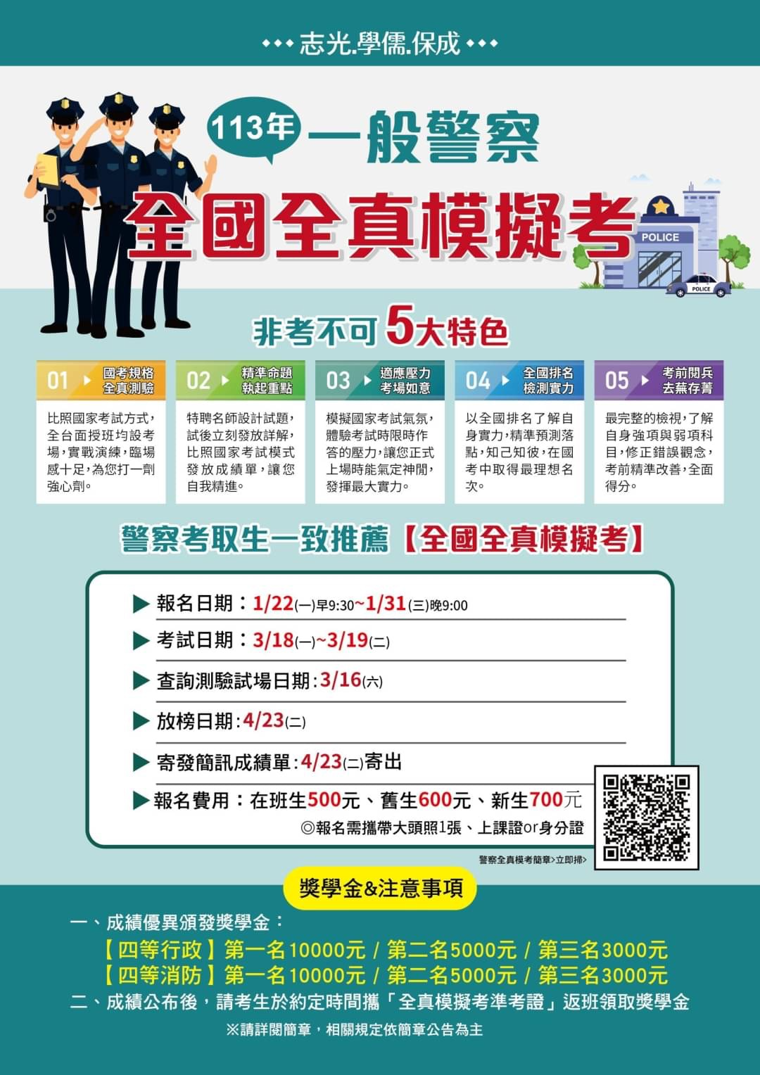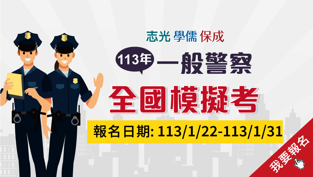 113一般警察特考全國模考,模擬一般警察正式考試,增加你考試的臨場感及自我學習進度的檢視,讓你在國考路上知彼知己‧百戰不殆