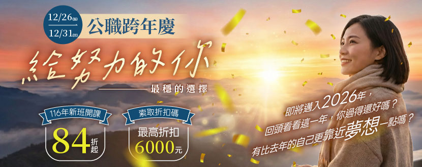 公職考試準備從現在開始!熱門類科錄取率高,公職具備「鐵飯碗」特性,不易受到景氣影響,長期有保障。 除固定薪水外,還有年終、退休金、各式津貼及保險。 升遷制度透明:依年資、考績或考試晉升,不用擔心人際或派系影響。 生活與工作平衡:相較部分民間企業,加班少、假期完整,更容易兼顧家庭。 社會地位與成就感:能直接服務民眾,貢獻社會,有成就感與認同感。