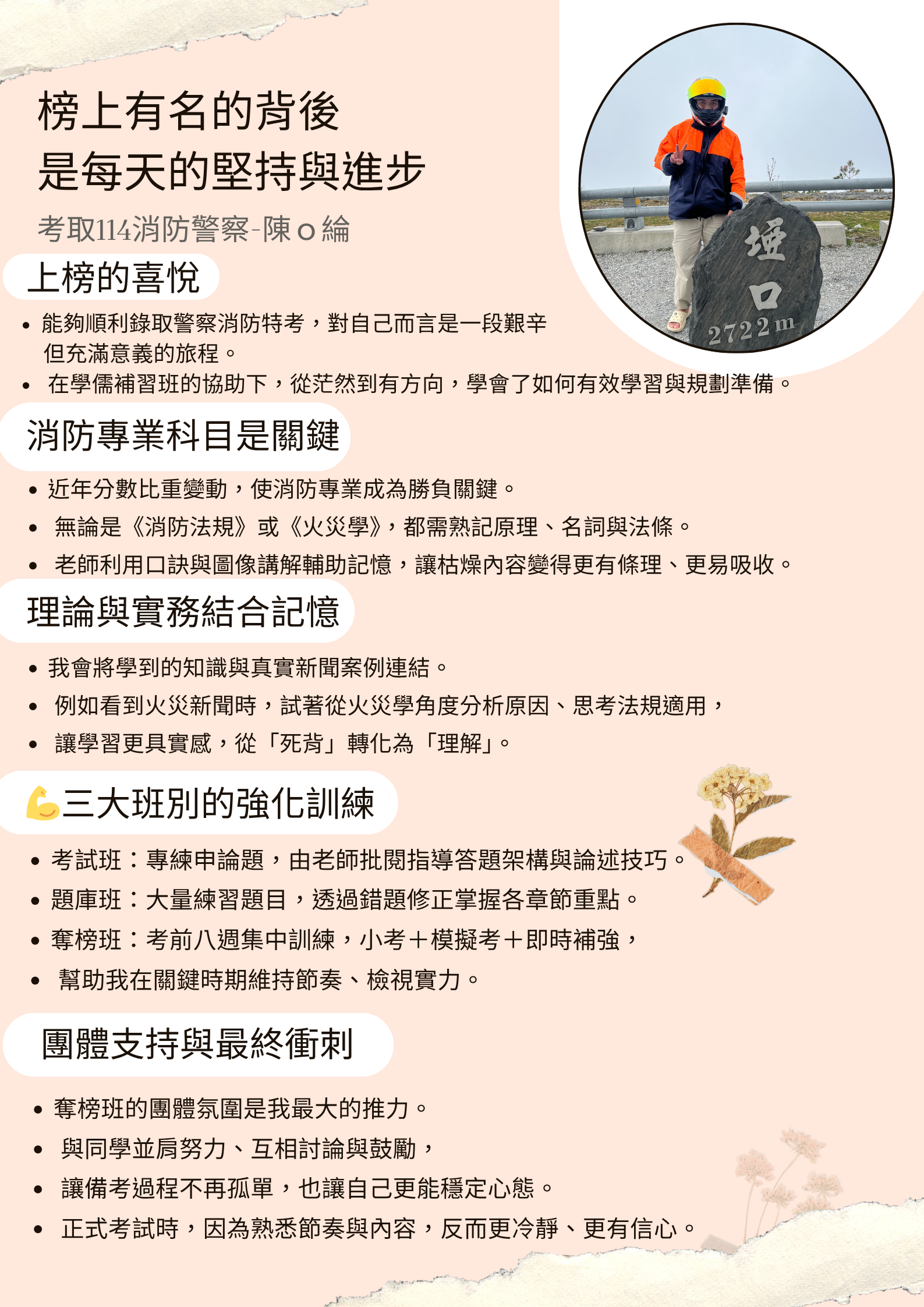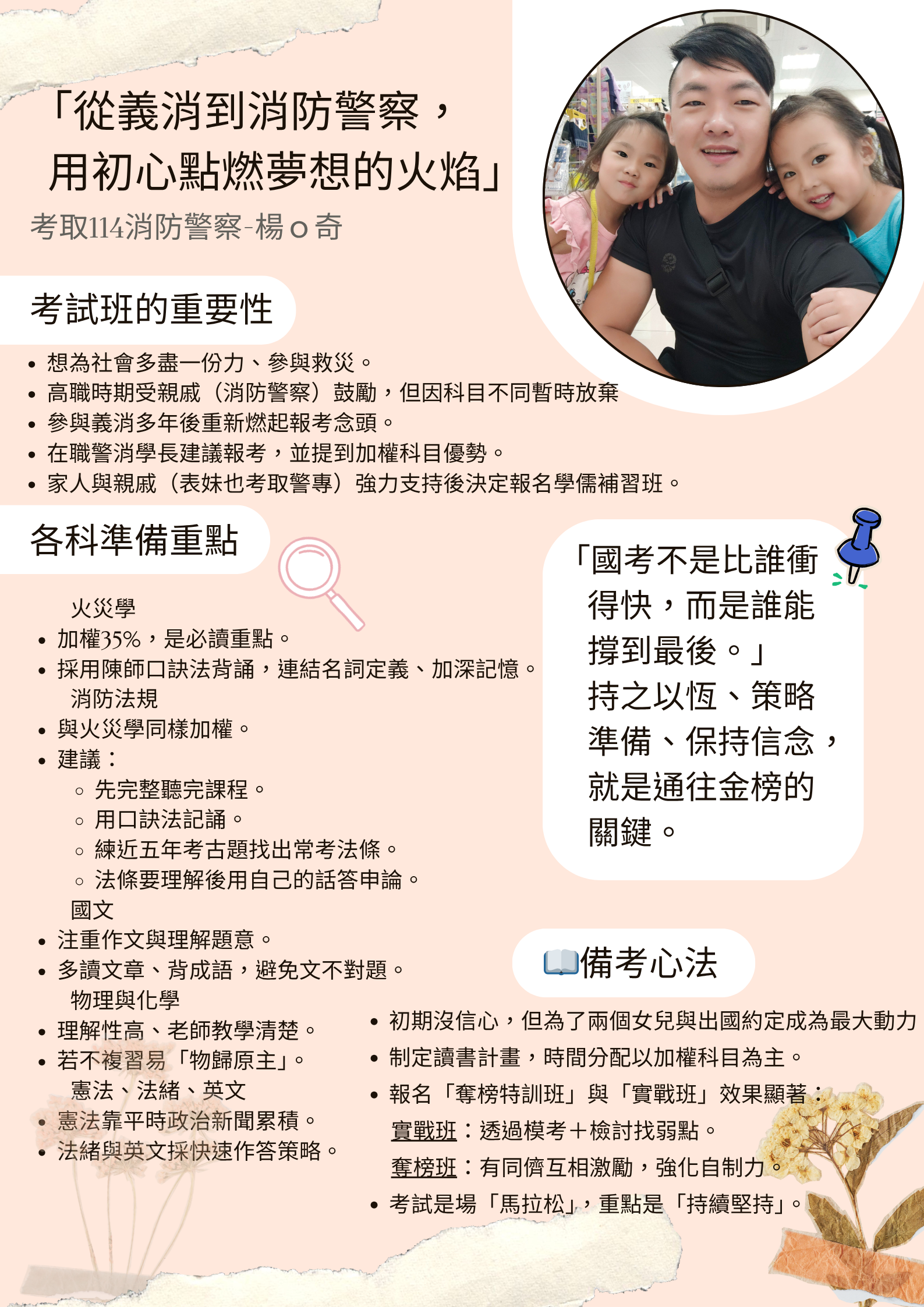 高三因將要畢業,對於自己的未來去路十分迷茫,由於就讀科系為飛機修護科,遇到突如其來的疫情,出國讀書的計畫被迫取消,導致許多計畫被打亂,之後大學考上國立機械工程系,也就沒有其他目標。剛好父親任職消防員,就詢問我有沒有想要當消防員想法,消防因疫情關係增列名額,經過和家人討論的結果,我毅然決然地就報名消防特考。雖然消防工作滿辛苦,但是薪水也相對比較優,自己也覺得消防員這份職業除了專業,也可以幫助許多人,而工作內容需要鍛鍊體能,剛好符合我喜歡運動的個性,於是在去年二月底報名兩年金榜專班,成為全職考生,投入消防考試。我在學期間就開始研讀專業科目,留給自己一年的時間好好打下基礎,畢竟沒有碰觸過相關科目,尤其又有申論題這種比較陌生的題型,會急著了解是正常的,但是後來透過課堂老師的講解、考試班及特訓班的練習,慢慢抓到作答方式,一步步掌握申論題的內容重點。