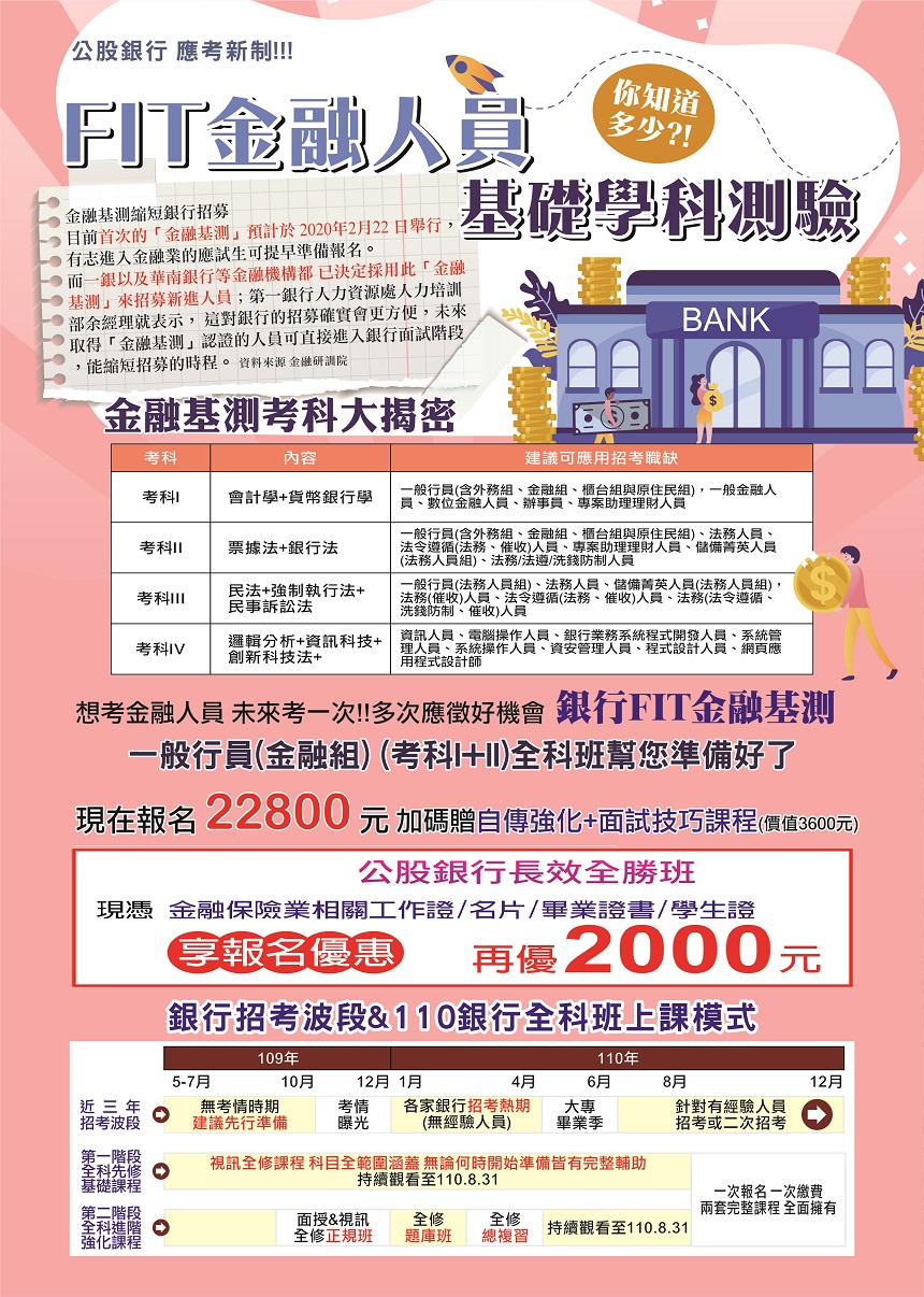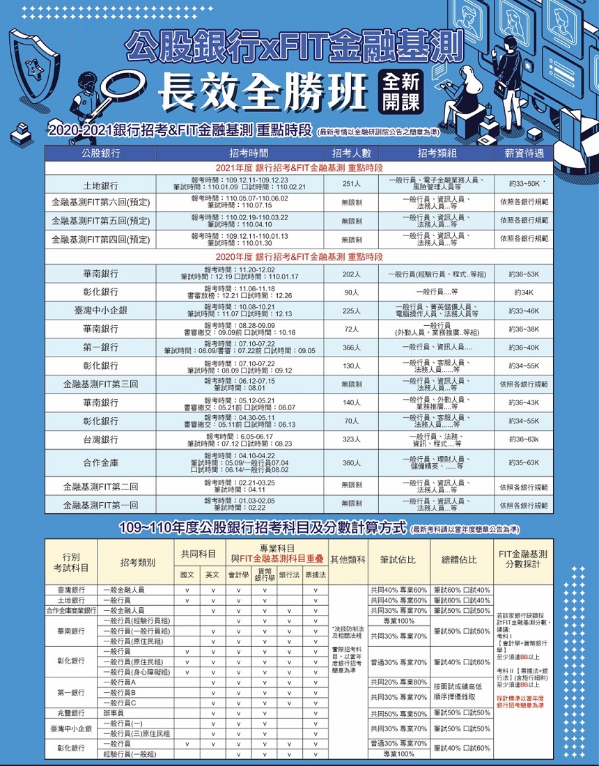 2020金融基測新制上路後,目前已有三家銀行(彰銀、華銀、一銀) 採用其成績作為徵才標準,鼓勵考生可同步準備銀行與FIT考試,並把握下一屆FIT考試機會,卡位千名上榜名額!
