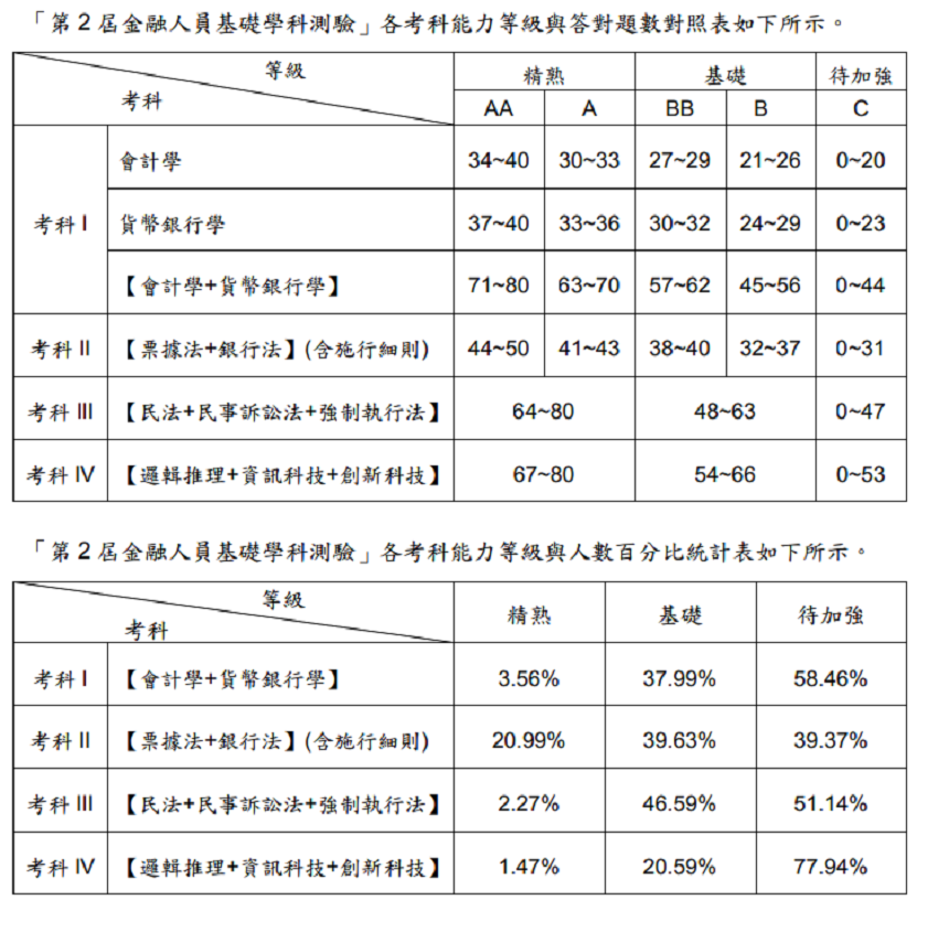 金融人員基礎學科測驗 4 個考科採標準參照方式呈現應考人測驗科目結果,透 過標準設定,各科評量結果分為「精熟(A)」、「基礎(B)」及「待加強(C)」3 個等級。 整體來說,成績「精熟」表示應考人不僅熟悉該科目的複雜概念,也能精準運用在 實務上;「基礎」表示應考人具備該科目運用在實務上的基本能力;「待加強」表示 應考人尚未具備該科目之基本能力。
