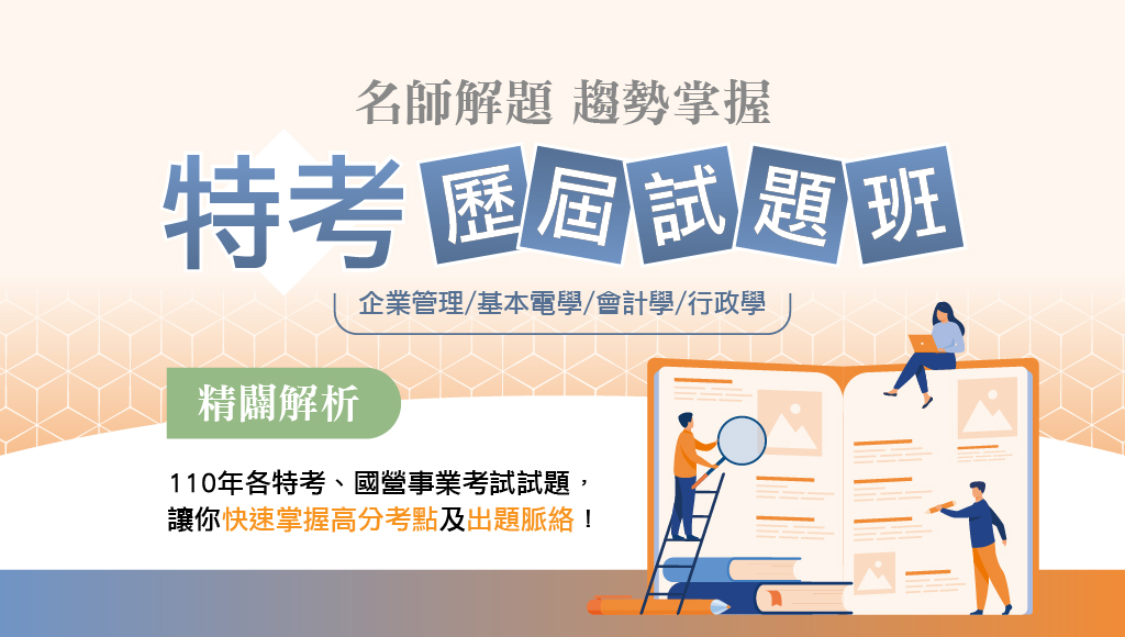 全國獨家推出歷屆試題班,將110年國營事業、鐵路特考、台電僱員、中油雇員等熱門就業考試,試題整合全方位分析,考前衝刺階段掌握高分考點及出題脈絡。