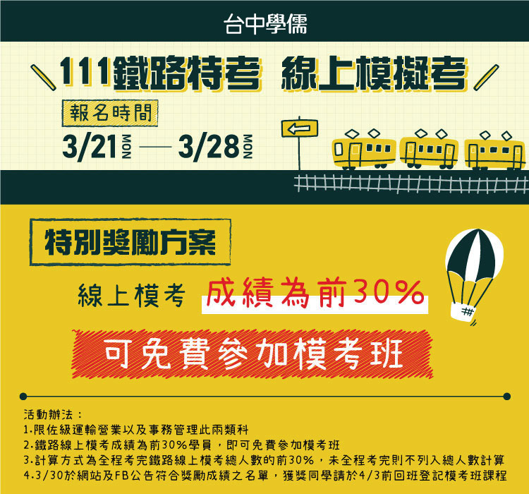 本次模擬考針對 國文/公民/英文/企業管理/鐵路法大意/鐵路運輸學/法學大意/基本電學/電子學大意/機械原理/機械製造學大意/電工機械大意 等12科,安排模擬考解析課程,課程時間待台中學儒另行公告。