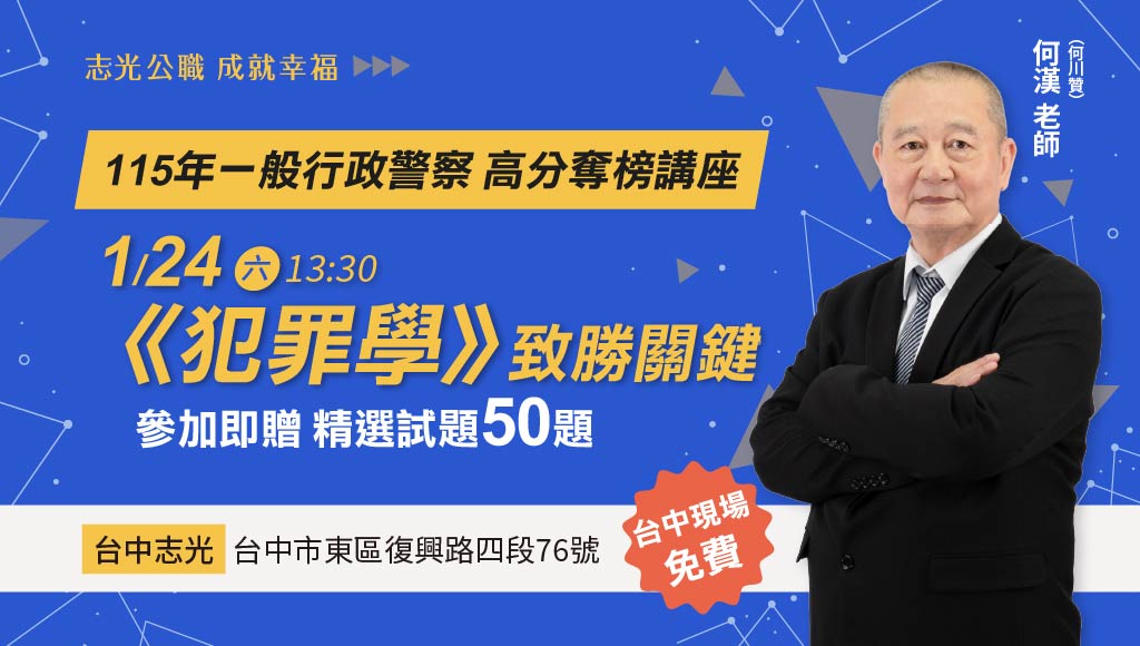 | 台中志光 | 1/24(六)13:30 犯罪學 何漢(何川贊)老師 2/07(六)16:30 奪榜特訓班說明會 |