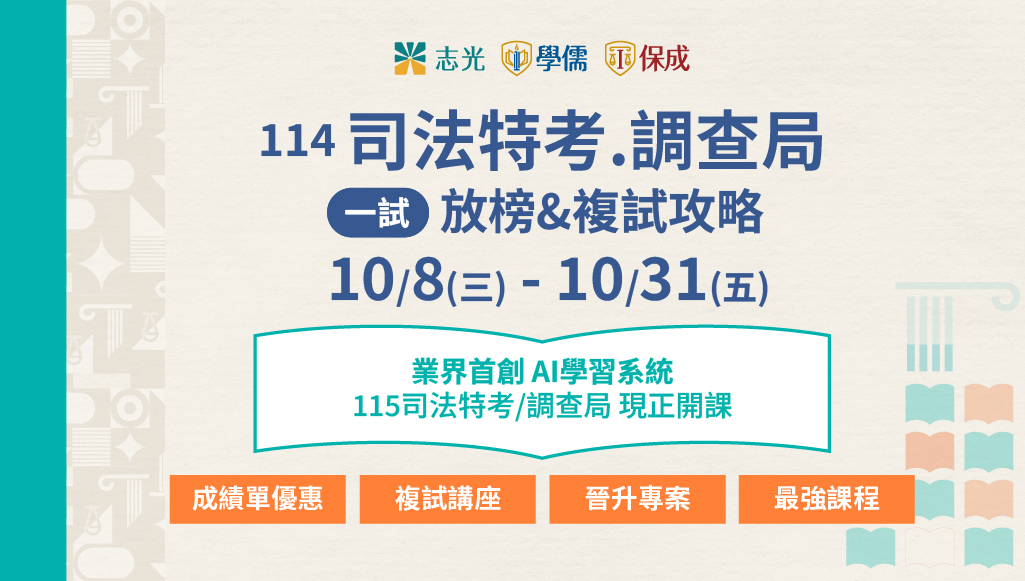 • 活動標籤: #司法特考-三等   #司法特考-四等   #司法特考-五等   #調查局特考-三等