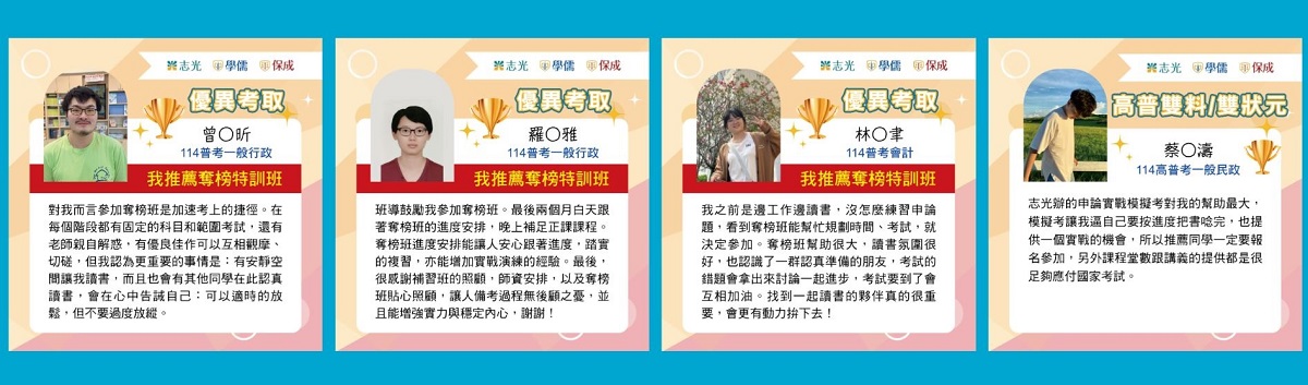 劉○揚 高普雙榜/應屆考取/一年考取 113高普考人事行政 申論準備上,凌襄(劉奕宏)老師的申論寫作課對我的幫助很大,由於公共人資是新考科,也因為內容抽象的緣故,老師會帶我們看相關題目套用哪些理論內容去解,相信隨著考科確定後,解答的方向也會更明確。