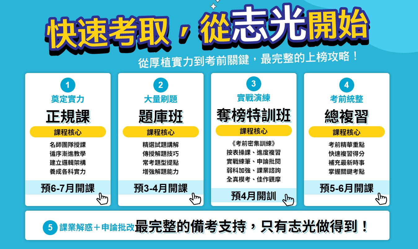 考前補強的功能課程,ex.大量練題、申論演練與批閱、重點提示等,倍增實力。