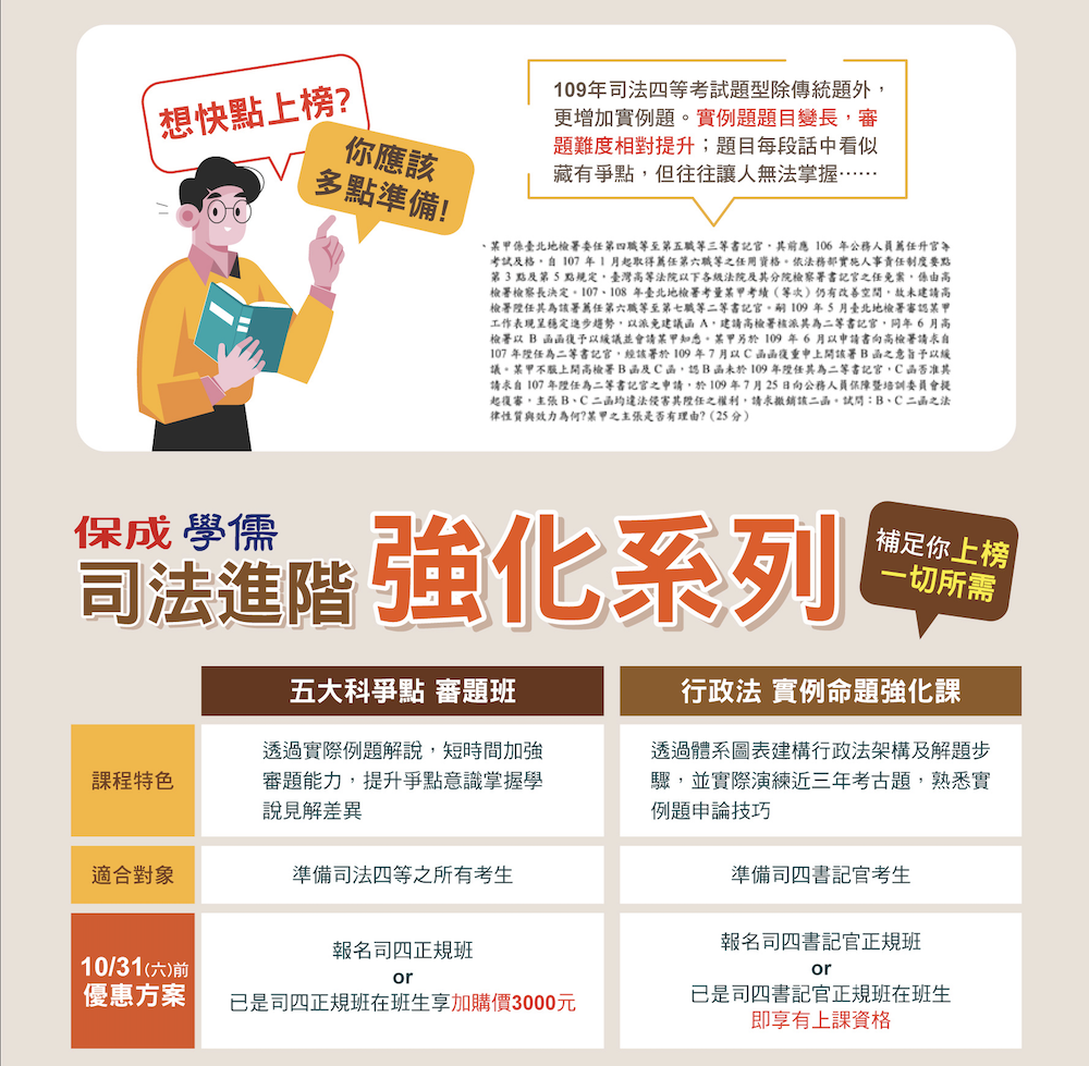 109司法特考放榜優惠|司法三等|書記官|法警|監所管理員|執達員|司法五等