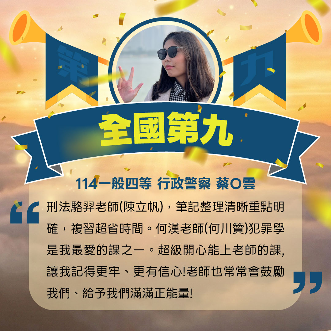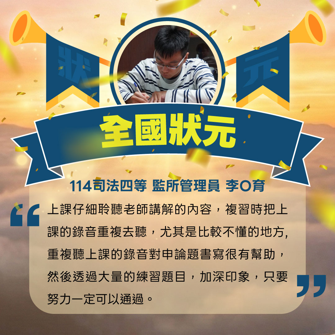 好險再給自己一個機會,經由天助自助的努力下,有幸上榜,真的很感謝學儒所提供的資源與師資。讓我順利上榜。」